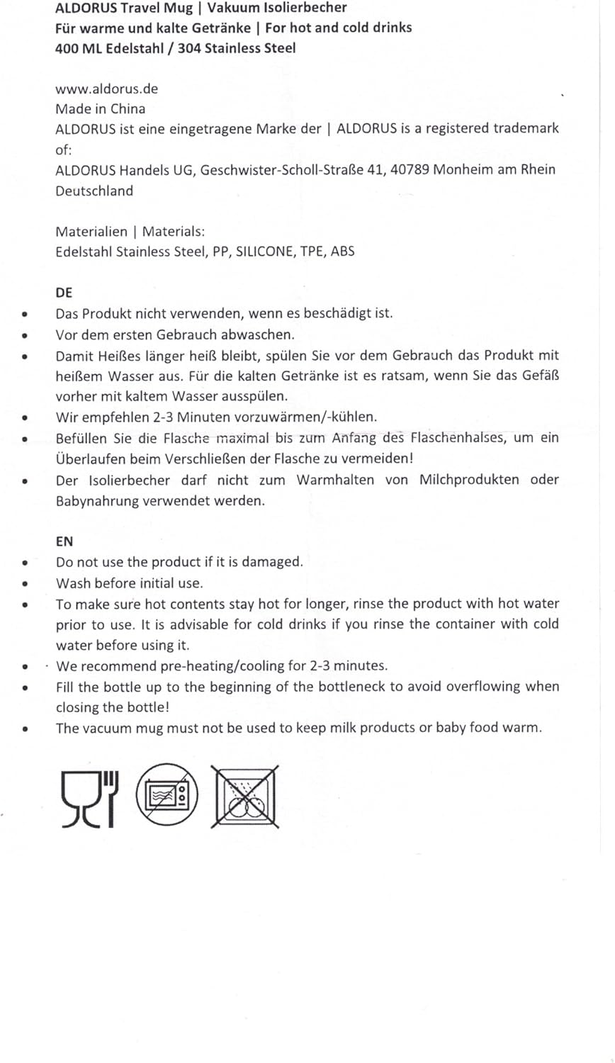 Aldorus Becher wurden speziell für den deutschen Markt hergestellt und zeichnen sich durch hohe Qualität aus. Die Trinkbecher werden aktuell in allen deutschsprachigen Ländern vertrieben und erfüllen alle gesetzlichen Anforderungen gemäß dem Lebensmittel- und Futtermittelgesetzbuch (LFGB) und EU-Chemikalienverordnung (REACH).